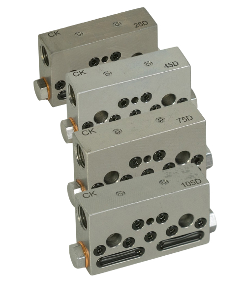 CK modular volumetric distributors are available in the 25 mm³, 45 mm³ and 105 mm³ per cycle versions.
