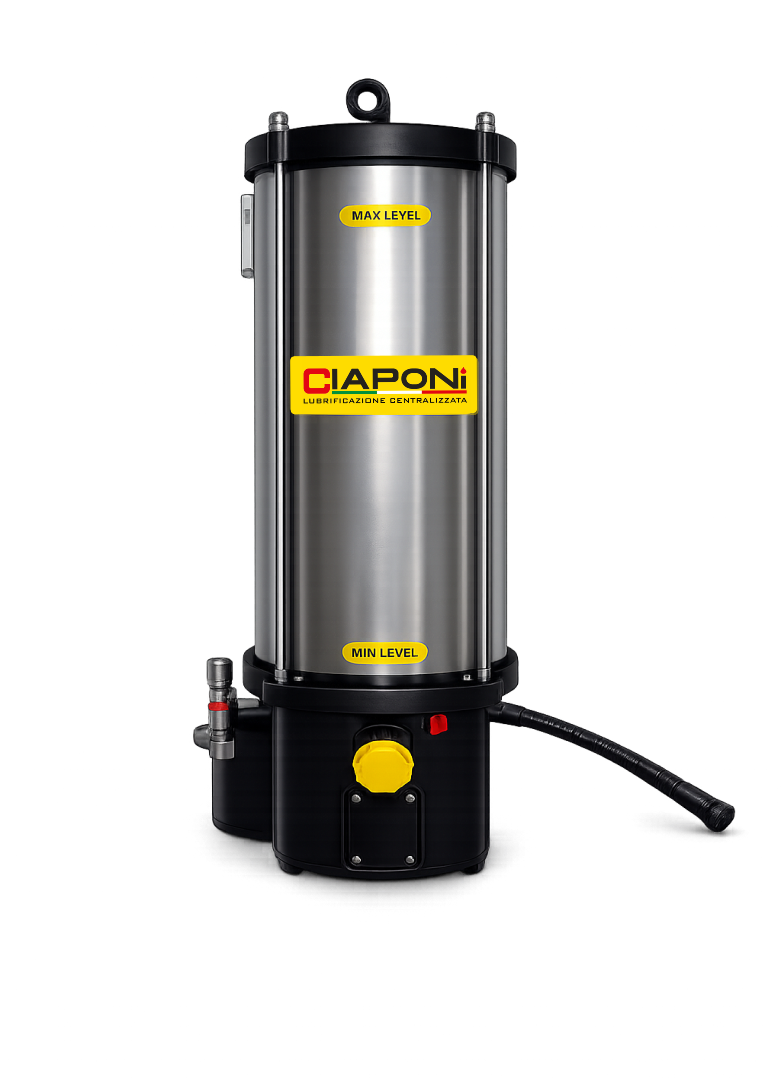 The electric pump is available in different configurations, with power supply options of 12V or 24V DC and 110V or 220V AC, reservoir capacities of 4 and 8 litres, control system with or without timer programming, end-of-cycle sensor, and minimum grease level indicator.